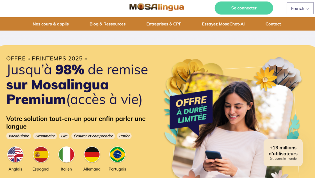 | MosaChat-AI | MosaChat-AI introduces a virtual tutor powered by artificial intelligence, available 24/7. This plan allows users to simulate conversations, receive instant feedback, and practice conversational skills without fear of judgment. | The first 300 minutes are free with a MosaLingua Premium subscription, and additional credits can be purchased for extended practice. |